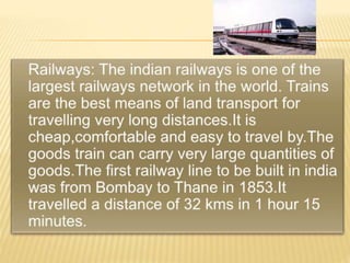 Man first traveled on foot and later tamed animals to carry him and his goods. He also learned to float rafts on rivers. The invention of the wheel improved land transportation, moving from hand carts to bullock carts and horse carriages. Today we have modern vehicles like cars, trucks, buses and trains for quick travel. We also have airplanes, so man now travels by land and air. Land transport includes roads and railways. Roads connect places and allow transport of goods anywhere, even remote villages. National highways connect important cities between states while state highways are also important.
