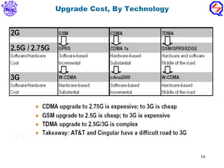 3G technologies enable higher bandwidth applications like video streaming and video calls by providing data rates up to 2Mbps. Common 3G standards include WCDMA, CDMA2000, and EDGE which evolved from 2G technologies like GSM and CDMA. These standards use technologies such as wider bandwidths and advanced modulation to increase speeds while maintaining compatibility with existing network infrastructure. Over 100 mobile operators worldwide have deployed 3G networks using these standards.
