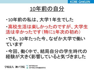10年前の自分 ・10年前の私は、大学1年生でした ・高校生活は楽しかったのですが、大学生 活は辛かったです(特に1年次の初め) ・でも、10年たった今、なぜか大学で働い ています ・今回、働く中で、結局自分の学生時代の 経験が大きく影響していると気づきました