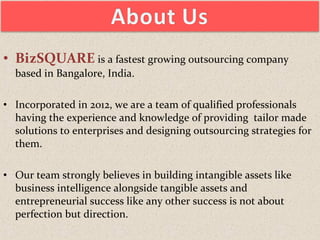 BizSQUARE is a fast-growing outsourcing company based in Bangalore, India that was incorporated in 2012. They provide a single-window concept for professional services to businesses and undertake various outsourcing contracts. Their multi-disciplinary team believes in building business intelligence alongside tangible assets for entrepreneurial success. They offer services such as accounting, taxation, and compliance to provide cost-effective and timely solutions for clients.