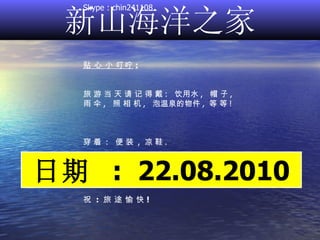 新山海洋之家于2010年8月22日组织了一次健康旅行,参观诚兴绿色有机公园和温泉浴,费用包括交通、用餐和多个活动。参与者需在2010年8月8日之前报名,并根据年龄支付不同的费用。请备齐旅行当天所需用品,并遵守行程安排。