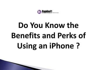 The document outlines the various benefits of using an iPhone, highlighting its superior design, high-quality camera, and highly responsive fingerprint sensor compared to Android devices. It also emphasizes the exclusivity of app launches on iPhones, excellent customer support, effective parental control features, and the convenience of Apple Pay. Overall, the iPhone is presented as a preferred choice for users seeking quality and reliability in their smartphone experience.