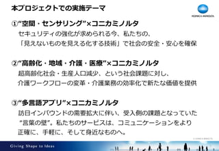 © KONICA MINOLTA 本プロジェクトでの実施テーマ 1 ①“空間・センサリング”×コニカミノルタ セキュリティの強化が求められる今、私たちの、 「⾒えないものを⾒える化する技術」で社会の安全・安⼼を確保 ②“⾼齢化・地域・介護・医療”×コニカミノルタ 超⾼齢化社会・⽣産⼈⼝減少、という社会課題に対し、 介護ワークフローの変⾰・介護業務の効率化で新たな価値を提供 ③“多⾔語アプリ”×コニカミノルタ 訪⽇インバウンドの需要拡⼤に伴い、受⼊側の課題となっていた “⾔葉の壁”。私たちのサービスは、コミュニケーションをより 正確に、⼿軽に、そして⾝近なものへ。