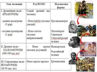Документ представляет собой лекцию о антропогенезе, описывающую эволюцию человека, его место в природе и факторы, способствующие этому процессу. Рассматриваются ключевые этапы развития человека и его предков, включая влияние биологических и социальных факторов на эволюцию. Также обсуждаются разные концепции происхождения человека и его анатомические отличия от других приматов.