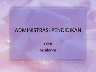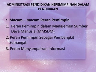 Dokumen tersebut membahas tentang administrasi pendidikan yang mencakup peran kepala sekolah, pengelolaan murid, personal, kurikulum, keuangan, layanan khusus, serta hubungan sekolah dengan masyarakat.