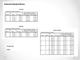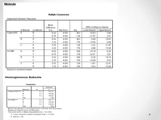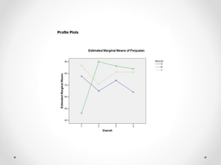 Dokumen ini membahas analisis varians (ANOVA), sebuah metode statistik untuk membandingkan ragam dari beberapa kelompok sampel. ANOVA digunakan untuk menguji pengaruh faktor-faktor tertentu terhadap variabel dependen dan memerlukan asumsi seperti normalitas dan homoskedastisitas. Contoh perhitungan dan analisis ANOVA satu arah dan dua arah juga dijelaskan, serta kesimpulan dari penelitian mengenai metode belajar terhadap prestasi siswa.