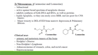 Alkylating agents: Meclorethamine*, Cyclophosphamide, Melphalan,Chlorambucil, Busulfan, Thiotepa