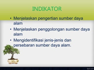 Dokumen ini membahas pengertian dan penggolongan sumber daya alam, termasuk sumber daya abiotik, biotik, dapat diperbaharui, dan tidak dapat diperbaharui. Selain itu, juga dijelaskan jenis-jenis sumber daya alam beserta persebarannya di Indonesia, seperti minyak bumi, gas alam, batu bara, dan logam mulia. Sumber daya alam berperan penting dalam kehidupan manusia dan memiliki variasi pemanfaatan yang berbeda-beda.