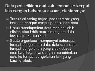Dokumen tersebut membahas tentang komunikasi data antar tempat yang memerlukan sumber data, media transmisi, dan penerima. Ada beberapa jenis media transmisi seperti kabel atau radiasi elektromagnetik. Perangkat keras komunikasi data seperti modem dan multiplexer digunakan untuk mentransmisikan data secara efektif.
