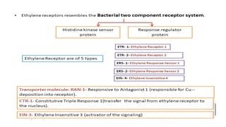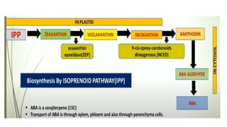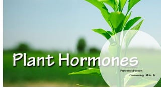 This document discusses various plant hormones (phytohormones), including their classes, functions, biosynthesis pathways, and roles in growth and development. The major classes covered are auxins, cytokinins, gibberellins, abscisic acid, ethylene, brassinosteroids, jasmonic acid, salicylic acid, and newer identified hormones. For each class, the document describes the key hormones, their effects on processes like cell division/elongation, fruit development, stress response, and more. It also presents a case study on how salicylic acid and acetyl salicylic acid increase tolerance to heat, cold, and drought stress in bean and tomato plants.