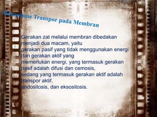 Dokumen ini menjelaskan tentang gerakan zat melalui membran, yang dibagi menjadi gerakan pasif dan aktif. Gerakan pasif meliputi difusi dan osmosis, sedangkan gerakan aktif melibatkan transpor aktif, endositosis, dan eksositosis. Berbagai proses dan faktor yang mempengaruhi difusi dan osmosis juga diuraikan.