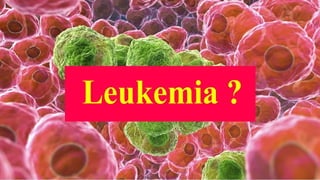 2) The presentation introduces the different types of leukemia, their symptoms, risk factors, methods of testing and stages of progression. Common treatments for leukemia including chemotherapy, biological therapy, targeted therapy and radiation therapy are discussed along with their side effects.