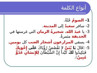 يتناول المستند موضوع قواعد اللغة العربية بما في ذلك أنواع الكلمات، الجملة الاسمية والفعلية، وتصريف الفعل حسب الزمن. يحتوي على أمثلة توضيحية عن الأسماء والأفعال وعلامات التذكير والتأنيث والحروف الجر. الغرض من الوثيقة هو تعليم القواعد اللغوية الشائعة في اللغة العربية.