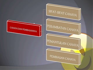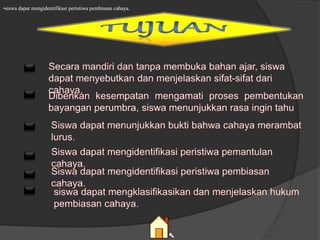 Dokumen ini membahas sifat-sifat cahaya seperti pemantulan, pembiasan, dan indeks bias. Siswa dapat mempelajari bagaimana cahaya memantul dan membiaskan saat melalui medium yang berbeda.