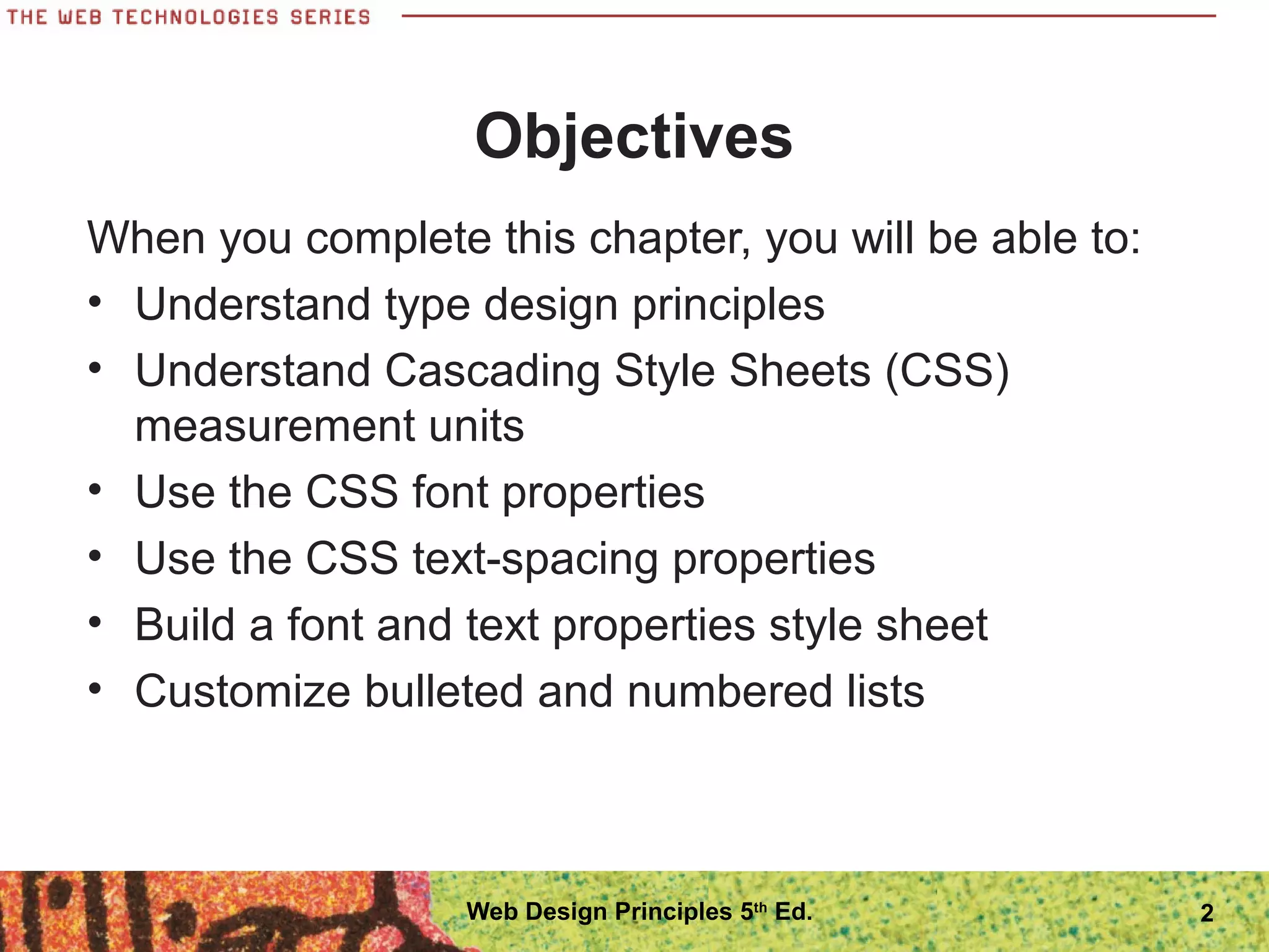This document chapter discusses web typography principles, including choosing fewer fonts and sizes, using common web fonts, specifying proprietary fonts, designing for legibility, avoiding text as graphics, understanding CSS measurement units like em and px, using CSS font properties like font-family and font-size, using text spacing properties like line-height and letter-spacing, and customizing lists. The objectives are to understand type design, CSS units, font properties, text spacing properties, and build a style sheet.