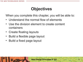 This chapter discusses page layout design principles. It covers the normal flow of elements, using divisions to create containers, floating layouts, and building flexible and fixed page layouts. The key points are: understanding normal element flow; using divisions and floats to build columnar layouts; containing floats to prevent broken layouts; and setting widths, margins, and wrappers to control flexible and fixed layout behavior.