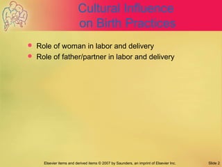 The document outlines the nursing care of mothers and infants during labor and birth, detailing factors influencing labor, stages of labor, and essential assessments. It emphasizes the importance of emotional support for the laboring woman and the roles of both parents during the process. Additionally, it covers monitoring procedures, care for the newborn, and postpartum responsibilities.