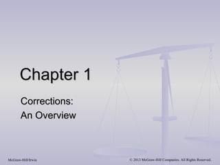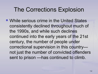 The number of people under correctional supervision in the US has continued to climb despite declines in crime rates. This is due to get-tough-on-crime laws, the War on Drugs, and parole authorities' fear of liability. There are now over 500 incarcerated per 100,000 people. Corrections involves prisons, jails, probation, parole, and alternative sentencing programs. The growing corrections population has led to an expanding workforce of over 750,000 nationwide. Corrections aims to achieve justice through the criminal justice system, which includes the police, courts, and corrections.