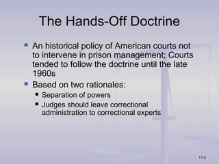 The document discusses the historical "hands-off doctrine" of American courts not intervening in prison management. It describes how prisoners' rights have expanded since the 1960s due to court rulings establishing certain constitutional rights apply to prisoners as well. The document outlines various ways prisoners can challenge prison conditions, such as through lawsuits, and discusses how the courts balance prisoners' rights with the needs of prison administration.