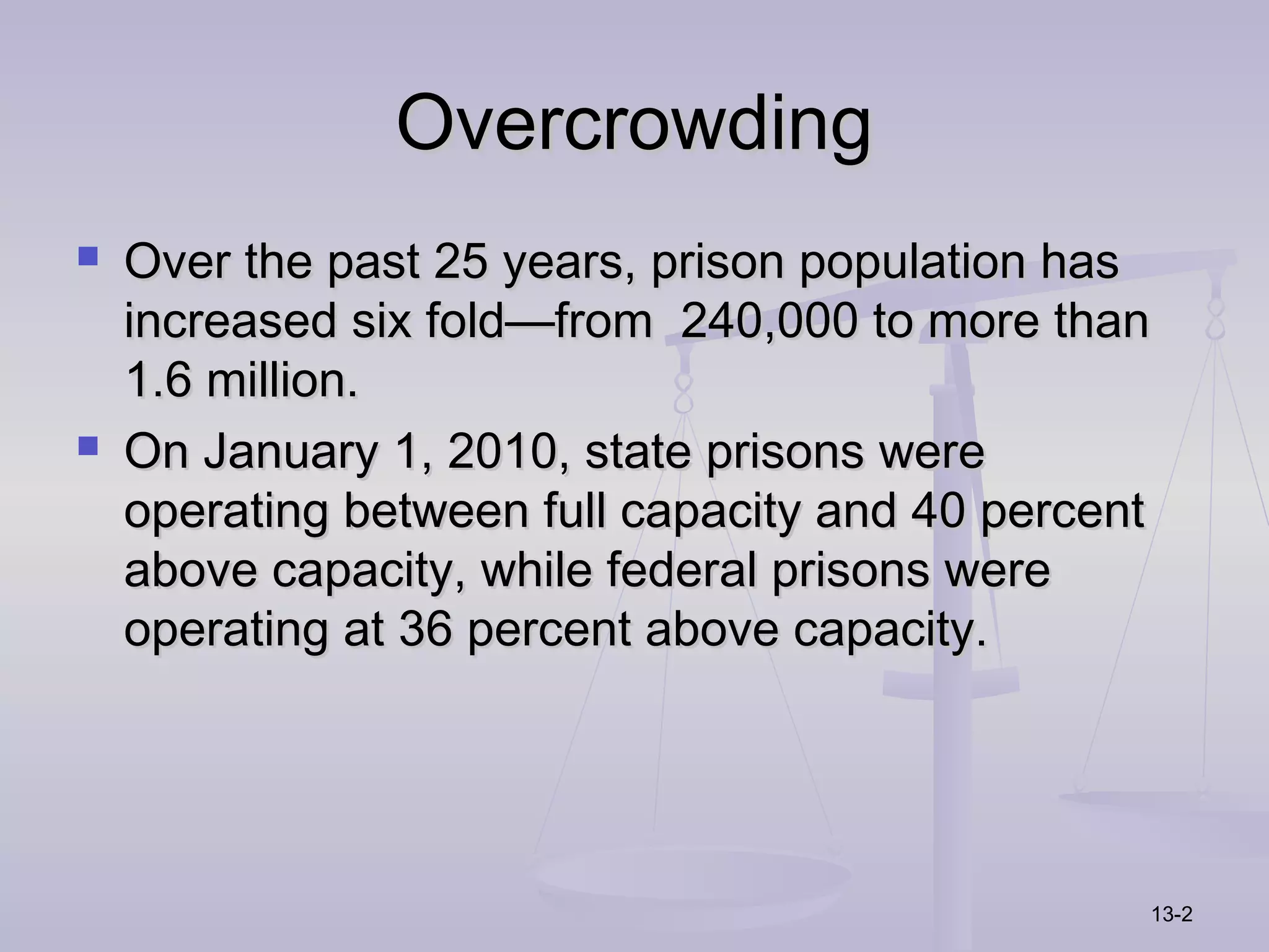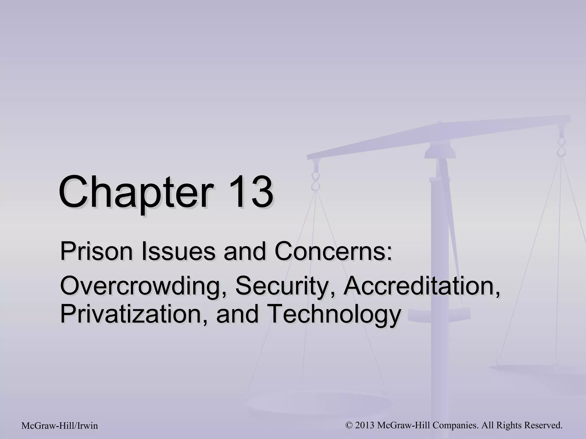 The document discusses several issues facing prisons including overcrowding, security threats from gangs, riots, and privatization. It notes that prison populations have increased six-fold in the past 25 years leading to severe overcrowding. Security threat groups like gangs make up around 15% of the prison population. The document also discusses accreditation, privatization of prisons, and new technologies being used in corrections.