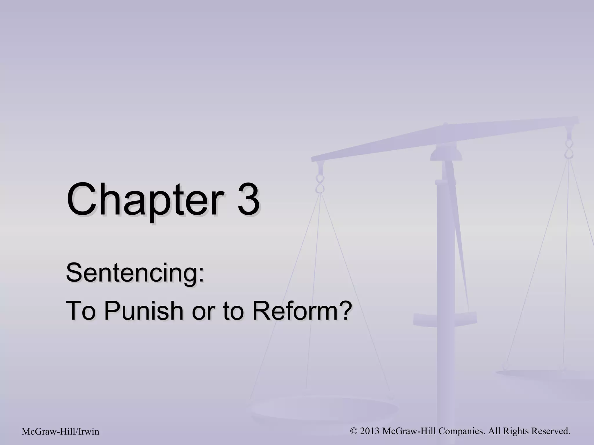 This document discusses sentencing philosophies and goals, including punishment, rehabilitation, deterrence, and restitution. It outlines different sentencing models such as determinate, indeterminate, and guideline sentencing. It also covers sentencing options, enhancements, and broader issues around proportionality, equity, and racial disparities in legislation and sentencing.