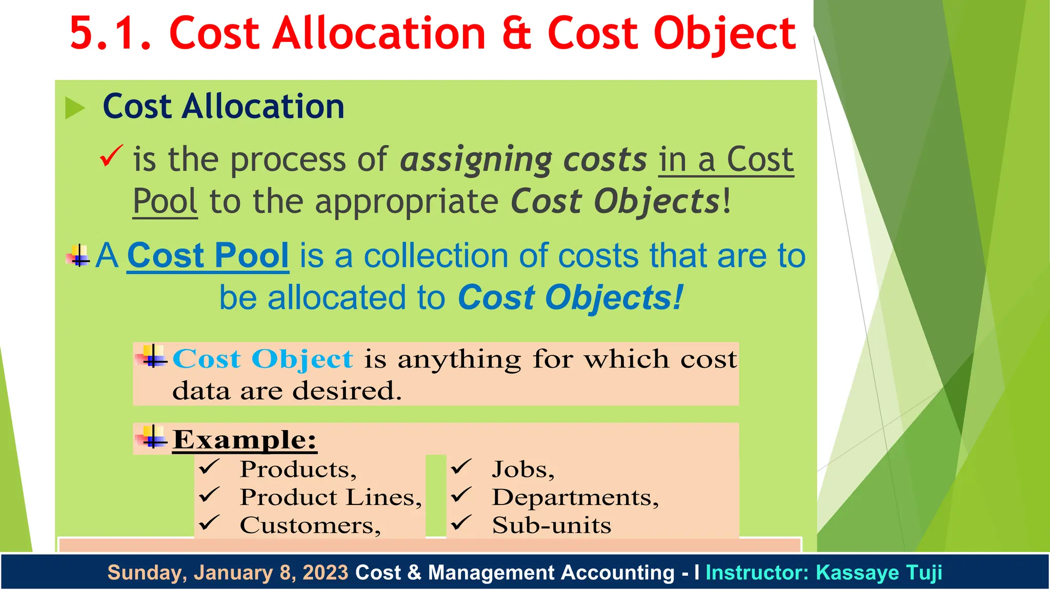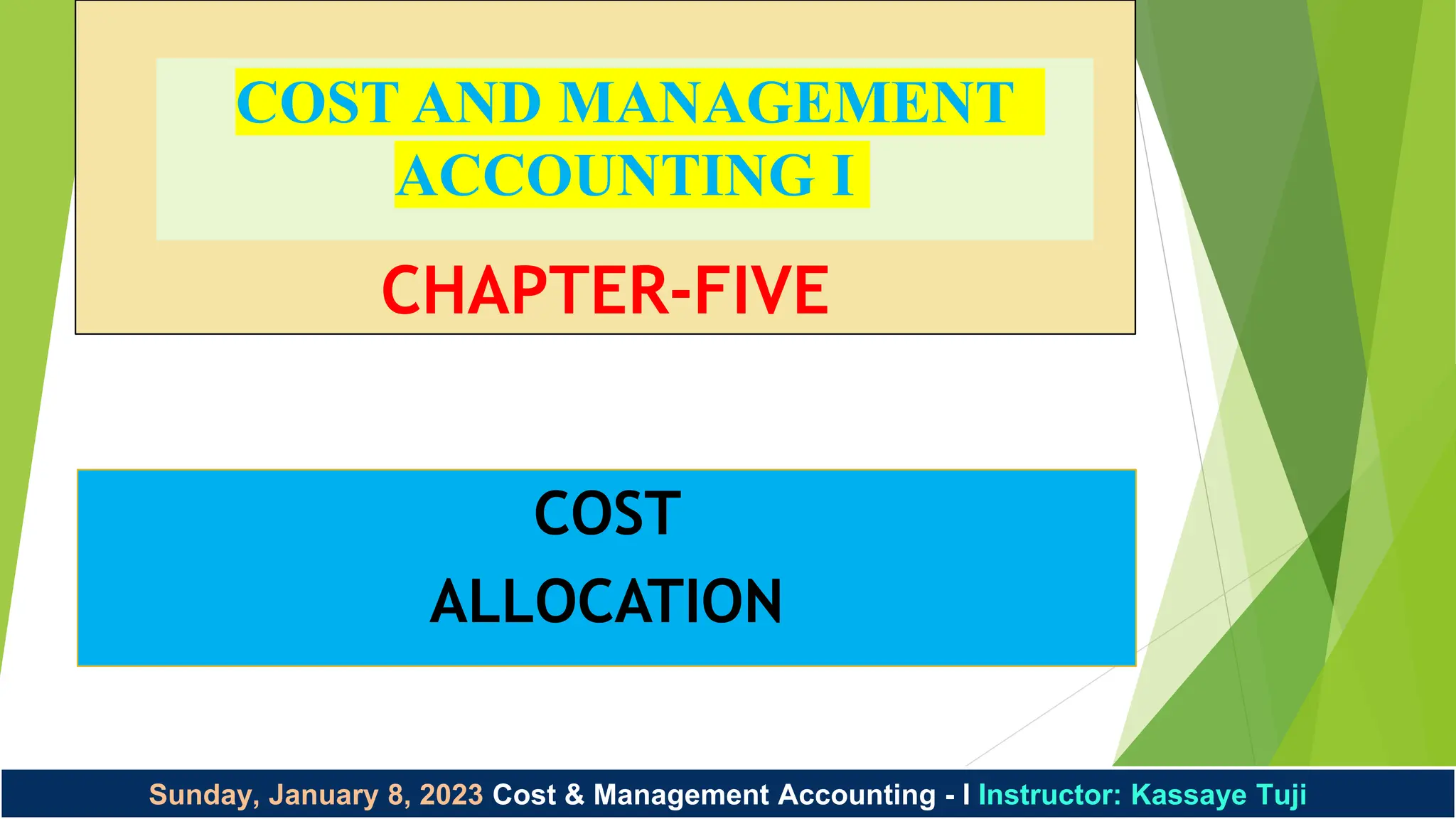 The document discusses cost allocation within cost and management accounting, defining cost pools, cost objects, and various methods of allocation. It outlines single-rate and dual-rate methods, as well as different approaches to allocate support department costs including direct, step-down, and reciprocal methods. Additionally, it addresses common costs and their allocation using stand-alone and incremental methods, highlighting their advantages and disadvantages.