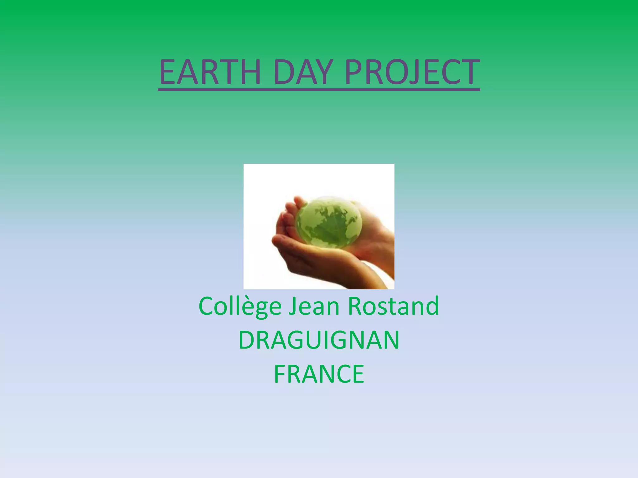 The document outlines recommendations from students at Collège Jean Rostand in Draguignan, France for an Earth Day project. The students suggest biking and walking instead of driving for short distances to conserve fuel, turning lights off when not needed, properly disposing of trash instead of littering, caring for plants, avoiding food waste, using both sides of paper, air drying clothes, switching TVs completely off, and saving water and electricity to help the environment. They thank participating students and families for helping with the powerpoint presentation.