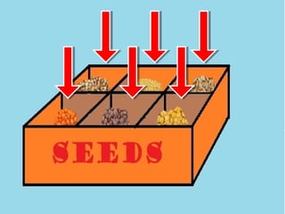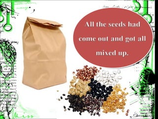 The document provides information about coordinating conjunctions and activities related to seed identification. It defines the 7 coordinating conjunctions as short words whose initials spell FANBOYS. It then describes Mr. Handy finding his seed packets mixed up after taking them out to plant. The final sections outline 3 activities for students - separating mixed seeds, matching seed pictures and names, and drawing and describing different seed types.