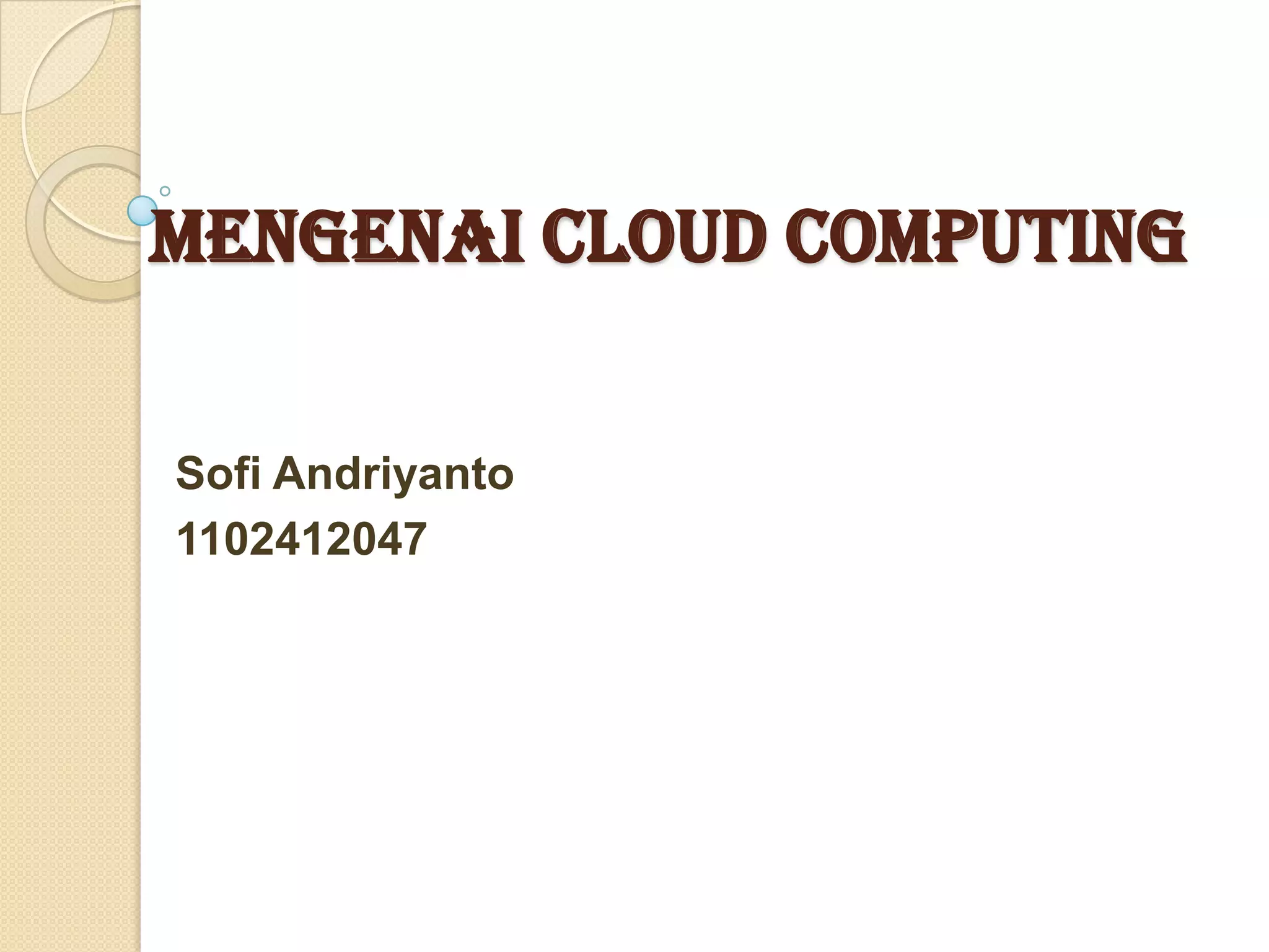 Cloud computing adalah penggunaan teknologi komputer dan pengembangan berbasis internet, dengan karakteristik seperti layanan mandiri, akses lebar, dan elastisitas. Terdapat tiga model layanan utama: SaaS, PaaS, dan IaaS, yang memiliki kelebihan dan kekurangan terkait investasi dan kepemilikan data. Informasi disimpan di server internet dan dapat diakses melalui berbagai perangkat pengguna.