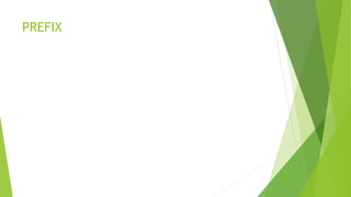 This document defines and provides examples of prefixes and suffixes. Prefixes are added to the beginning of root words to modify their meaning, such as "un-" making "happy" into "unhappy". Suffixes are added to the end of root words and can change the class of the word or add further description, for example "-ful" turning "forget" into "forgetful". Tables list common prefixes and suffixes with their meanings. Rules for adding prefixes and suffixes are outlined, such as using a hyphen for prefixes added to nouns and retaining spelling. Overall, the document serves as a reference for how prefixes and suffixes modify word meanings.