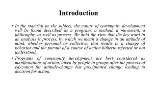 The document outlines the key steps and strategies involved in community development processes. It discusses that community development is an educational process that helps communities change attitudes and behaviors to improve conditions. The main steps described are initial contact and rapport building, systematic discussion of issues, planning and executing action projects, and concluding projects with evaluation. It also discusses various strategies used like collaborative participation, action research, education, empowering community leadership, and ensuring community self-sufficiency through skills development. The goal is for communities to improve with less dependence on outside assistance over time.