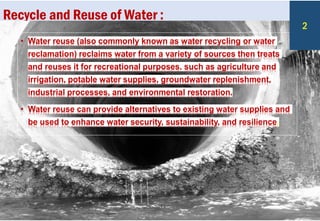 The document discusses direct and indirect potable water reclamation through case studies in Nagpur, India and Windhoek, Namibia. In Nagpur, a 130 MLD sewage treatment plant treats wastewater which is then supplied to a power plant. This project saves freshwater and generates revenue for the municipal corporation. In Windhoek, a water reclamation plant treats over 20,000 cubic meters of sewage per day to produce 21,000 cubic meters of drinking water per day, supplying over 300,000 inhabitants and accounting for 35% of the city's water supply. The multi-barrier treatment process and public education were keys to the success of direct potable reuse in Windhoek.