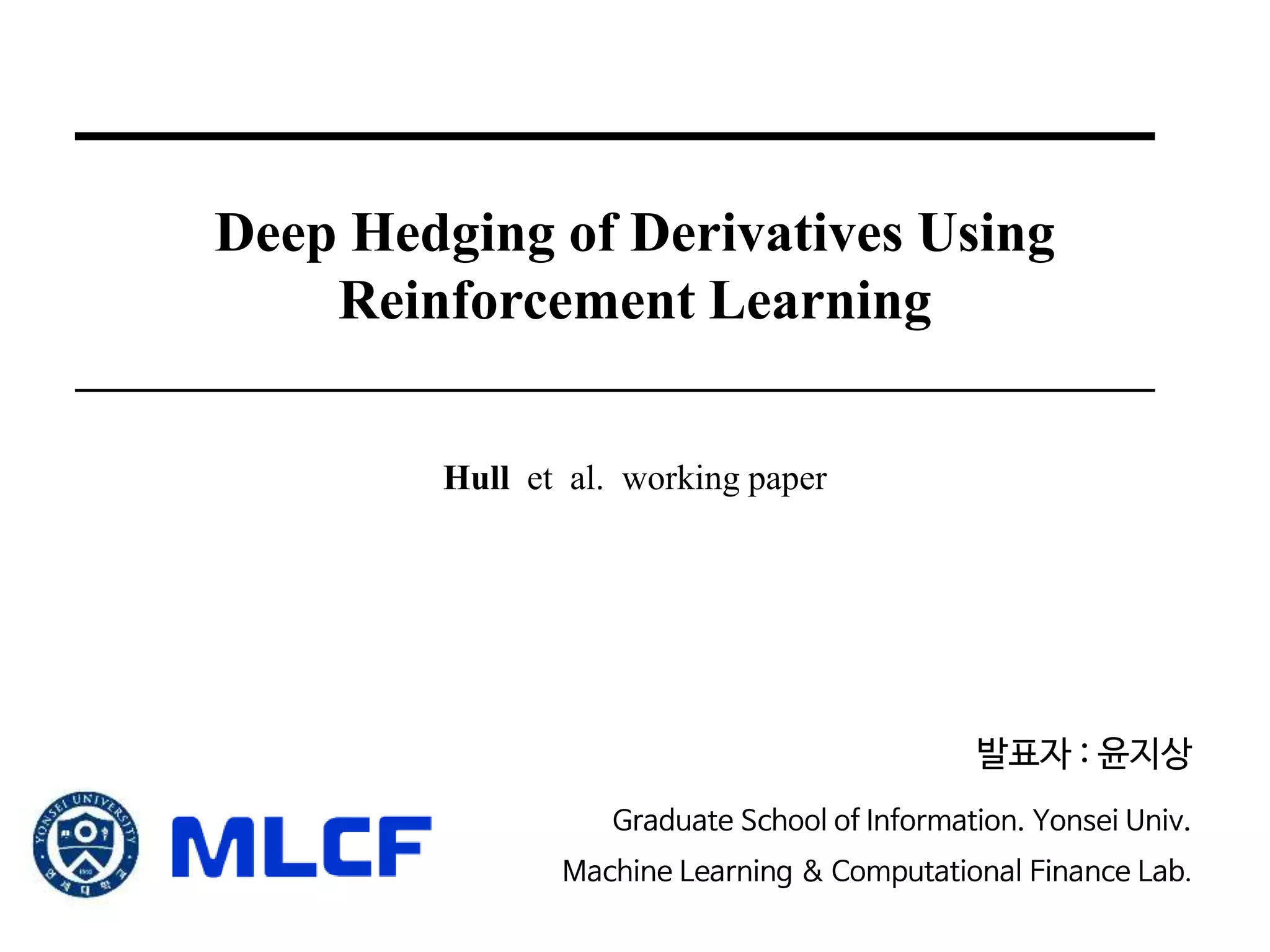 The document describes using reinforcement learning to implement hedging of derivatives. It discusses: