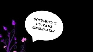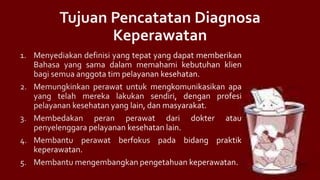 Dokumen ini membahas tentang diagnosis keperawatan sebagai langkah penting dalam proses keperawatan yang mencakup penilaian terhadap respon individu terhadap masalah kesehatan. Penulisan diagnosis keperawatan diperlukan untuk memberikan asuhan yang komprehensif, meningkatkan komunikasi antar profesional kesehatan, dan menjamin mutu pelayanan keperawatan. Selain itu, dokumen ini menjelaskan sumber kesalahan dalam diagnosis keperawatan dan perbedaan antara diagnosis keperawatan dan medis.