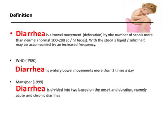 This document discusses diarrhea in children. It defines diarrhea as having more than 3 loose or watery bowel movements per day. Diarrhea can be caused by infections from bacteria, viruses or parasites, malabsorption of nutrients, poor diet, psychological factors, and other infections elsewhere in the body. The pathophysiology involves increased secretion of water and electrolytes into the gut due to infection or malabsorption. Nursing assessments for children with diarrhea include monitoring fluid and electrolyte balance, nutrition status, body temperature, and skin integrity. Nursing care plans aim to prevent dehydration, maintain nutrition, monitor for infection, and prevent skin breakdown.