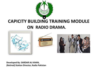 The document provides guidance on producing radio dramas. It discusses the origins of drama in ancient Egypt, Greece and India. It outlines the key differences between stage plays and radio plays, noting that radio plays rely more on voice variations, sound effects, and music to set the scene. The document then covers important elements of drama including characters, plot, conflict, climax and resolution. It provides details on structural aspects like Freytag's pyramid model and explains techniques for effective radio drama production such as using narration, descriptive dialogues, sound effects, music and precise language.