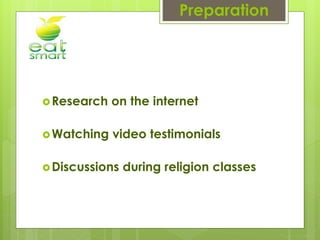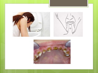 The document discusses eating disorders such as anorexia and bulimia. It provides information on triggers such as negative self-image and media influence. It describes the consequences of eating disorders which can be social, psychological, mental, and medical. It defines anorexia as extreme weight loss and fear of gaining weight. Bulimia involves binge eating and then vomiting or using laxatives. The document provides tips to avoid eating disorders such as being happy with yourself, not comparing to others, talking to someone about problems, and remembering the negative health impacts.