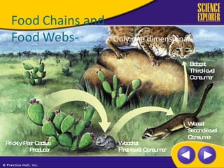 The document describes an activity where students build an energy pyramid together to demonstrate how energy is transferred between trophic levels in a food chain. The teacher acts as the producer and provides energy to primary consumers. As the activity progresses down each trophic level, the amount of available energy is cut in half, supporting fewer organisms at each subsequent level. This shows how pyramids depict less available energy and fewer organisms at higher trophic levels due to energy being lost as heat at each transfer between levels.