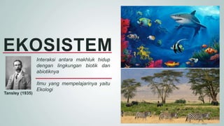 Dokumen ini menjelaskan tentang ekosistem yang terdiri dari komponen biotik dan abiotik, interaksi antar komponen, serta aliran energi dalam ekosistem. Juga dibahas mengenai daur biogeokimia seperti daur air, nitrogen, dan fosfor yang penting untuk keseimbangan ekosistem. Materi ini mencakup konsep rantai makanan, piramida ekologi, serta peran setiap komponen dalam mendukung kehidupan.