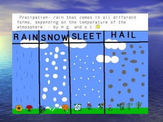 The document discusses various factors that affect weather, including cloudiness and precipitation. It describes different types of clouds and how they indicate upcoming weather conditions. Instruments for measuring and observing weather are also outlined, such as rain gauges and weather stations. Weather forecasting is important to be prepared for changing conditions.