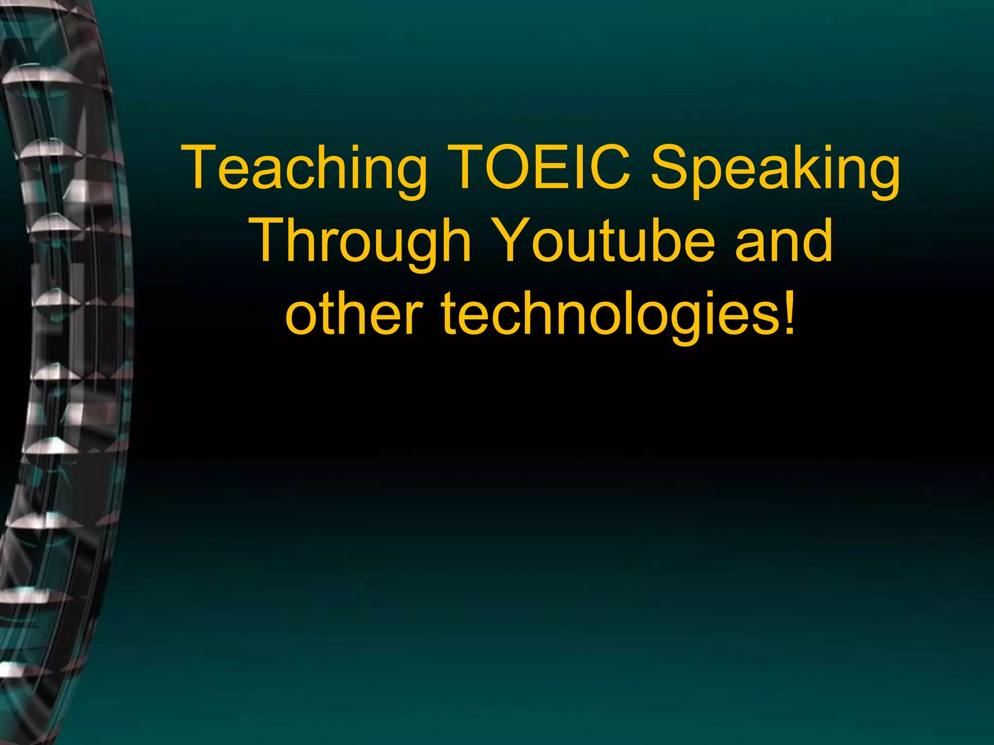 The document provides guidance and examples for teaching TOEIC speaking skills through using YouTube videos and other technologies. It outlines sample test questions, strategies for describing pictures and responding to questions, and suggestions for activities like role playing customer service scenarios that students can practice. The document aims to help students improve their TOEIC speaking skills through interactive online exercises and examples.