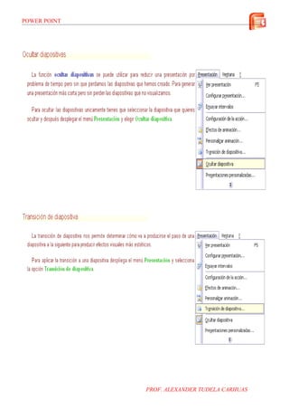 This PowerPoint presentation discusses animations and transitions in PowerPoint. It was created by Professor Alexander Tudela Carhuas and focuses on how to use different animations and transitions to enhance PowerPoint presentations.