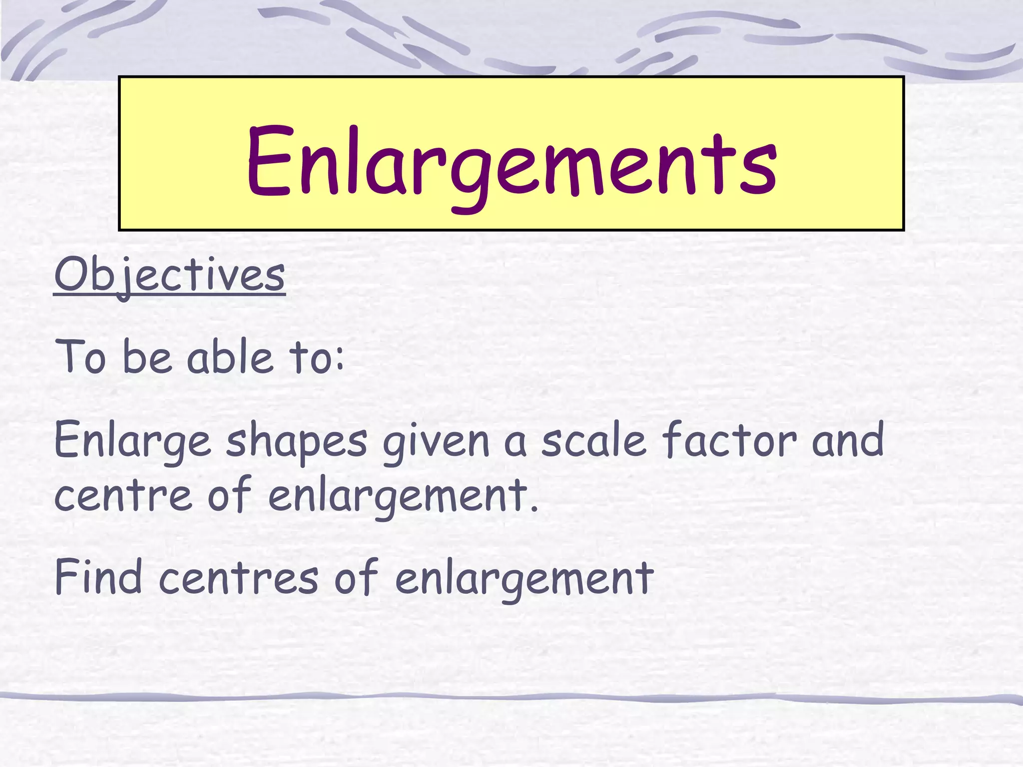 The document discusses enlargements of shapes using scale factors and centers of enlargement. It explains that the scale factor determines the size of the enlargement relative to the original shape. The center of enlargement determines where the enlarged shape is positioned. It provides examples of enlarging triangles with different scale factors and centers, including when the center is inside the original shape or when the scale factor is fractional. It also describes how to find the center of enlargement given a original and enlarged shape.