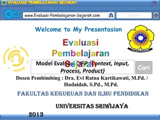 Model evaluasi CIPP (Context, Input, Process, Product) merupakan model evaluasi program yang melihat empat dimensi yaitu konteks, masukan, proses, dan hasil. Model ini bertujuan untuk mengevaluasi kesesuaian program dengan konteks awal, sumber daya yang diterapkan, pelaksanaan program, serta manfaat yang dicapai.