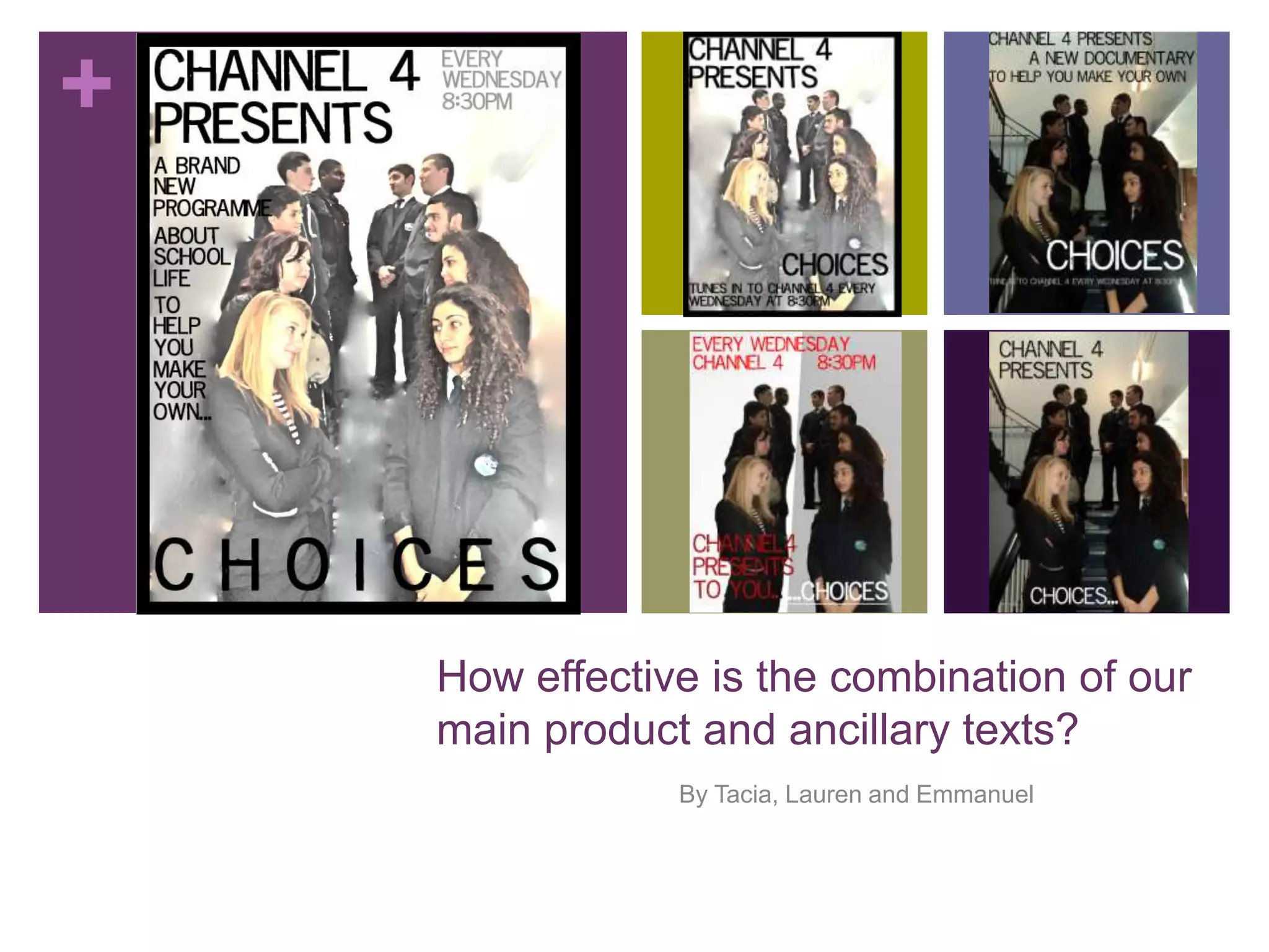 The group created a poster and radio advertisement to promote their documentary on 6th form choices. They tested different poster designs with an audience and selected one that was most appealing. For the radio ad, they included sound effects and music to catch listeners' attention while conveying information. The ancillary texts will appear in school newsletters, libraries, magazines and billboards to reach their target audience of secondary and 6th form students as well as a wider audience. Audience screening provided valuable feedback to refine the promotional materials.