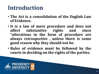 1. The Act codified and consolidated the English law of evidence and established uniform rules of evidence across courts in India. It is a procedural law that does not affect substantive rights.