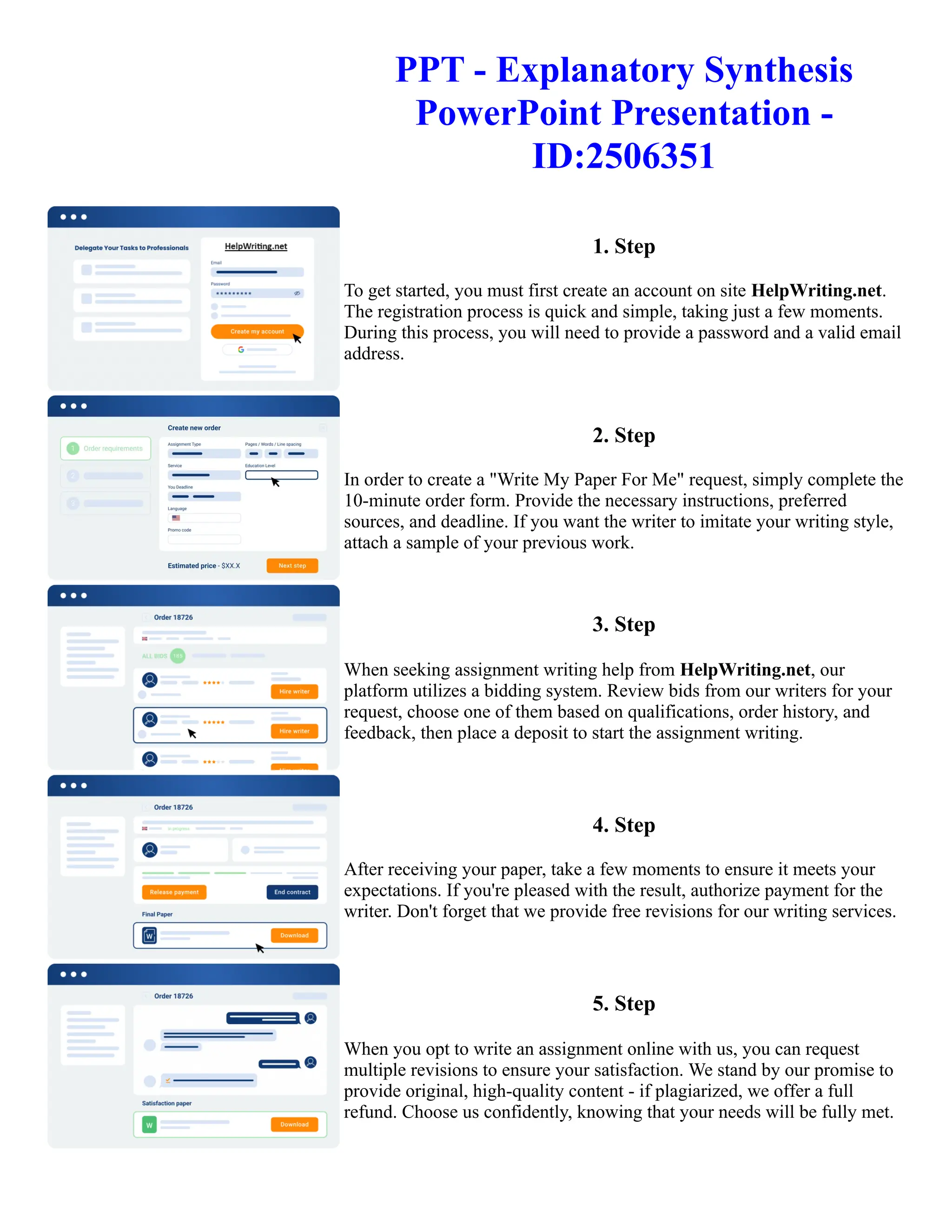 The document provides instructions for requesting and completing an assignment writing request through the HelpWriting.net website. It involves 5 steps: 1) Creating an account, 2) Completing an order form with instructions and deadline, 3) Choosing a writer based on bids, qualifications and reviews, 4) Reviewing and approving the completed paper, and 5) Requesting revisions if needed, with the guarantee of a refund for plagiarized work. The process aims to ensure customer satisfaction with original, high-quality content.