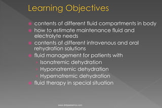 1. The contents of fluid compartments in the body and how they change with age. Total body water is a higher percentage of body weight in neonates and decreases with age.