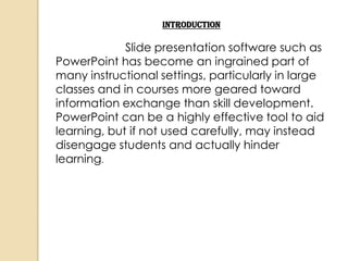 The document discusses effective use of PowerPoint for presentations. It notes that PowerPoint can engage students if used carefully, but may disengage them if overused. It outlines advantages like engaging multiple learning styles, and challenges like presentations being too teacher-centered. It provides examples of using PowerPoint for case studies, student response clickers, as worksheets, and narrated downloads. It concludes with best practices for delivery, slide construction, and other ideas to enhance presentations.