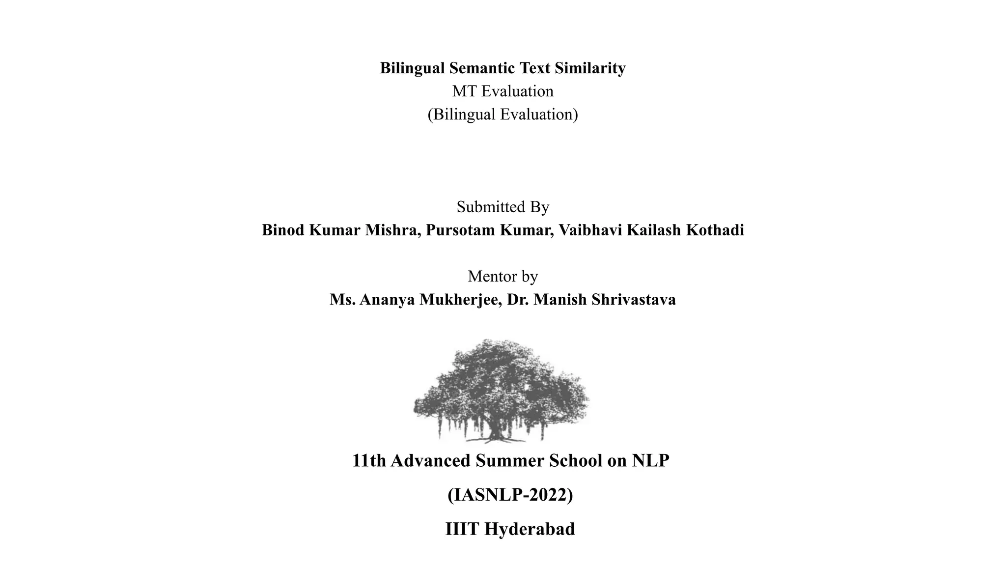 This document summarizes experiments on bilingual semantic text similarity using various word and sentence embedding approaches. It fine-tunes the COMET machine translation evaluation model on 100,000 parallel English-Hindi sentences and compares the results to other sentence encoders like LaBSE, LASER and SBERT using Pearson correlation. LaBSE and SBERT are found to give the best results. Future work could include fine-tuning models on larger data to potentially achieve better performance.